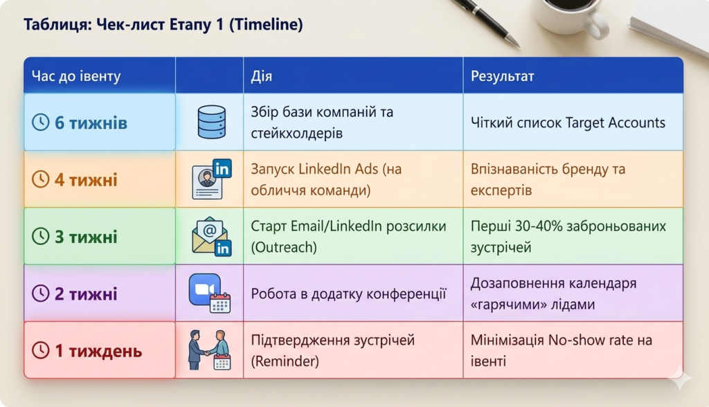 Багато хто вважає, що конференція починається з реєстрації на локації. Насправді вона починається за 4–6 тижнів до вильоту. Ваша мета – заповнити 70% робочого календаря зустрічами ще до того, як ви пройдете контроль в аеропорту.
