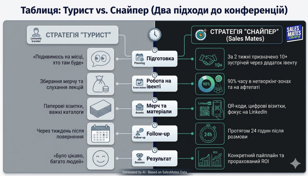 Більшість IT-компаній сприймає конференції як можливість «показати себе» або «потусуватися з ком’юніті». Результат? Порожні візитниці, нульовий ROI та втома. У Sales Mates Library ми розглядаємо конференцію як інтенсивний цикл продажів, стиснутий у 2–3 дні.